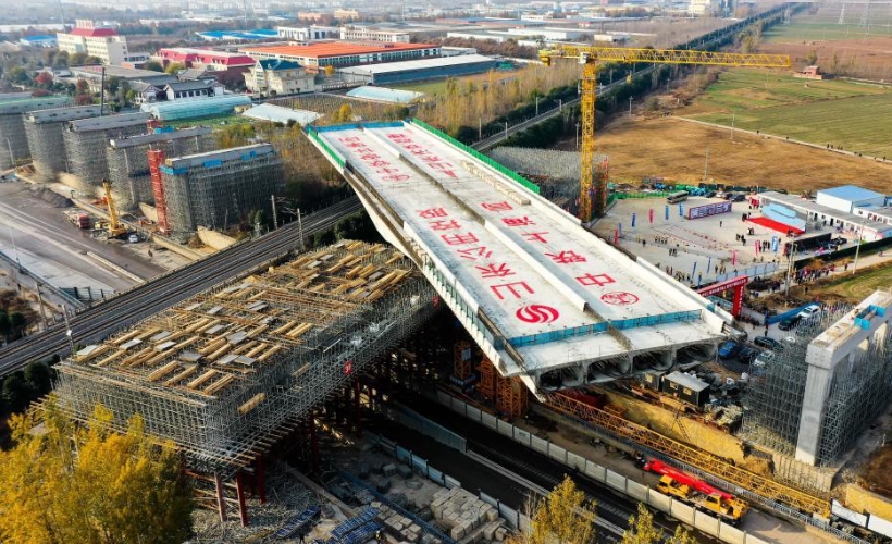 濟曲快速路上跨京滬鐵路立交橋連續梁轉體成功