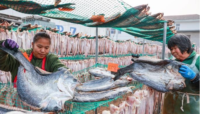 入冬后曬魚干,是膠東半島漁家的傳統(tǒng)習(xí)俗。12月6日,在山東省榮成市石島管理區(qū)王連街道北橋頭村一處漁家院子,村民抓緊時(shí)間晾曬魚干,供應(yīng)市場(chǎng)。當(dāng)?shù)亍盎厮挑~干”制作工藝已有上千年歷史。 近年來(lái),榮成漁民通過(guò)電商平臺(tái),將“回水咸魚干”制品銷往各地,不但增加收入,也帶動(dòng)了鄉(xiāng)村產(chǎn)業(yè)振興。 中新社