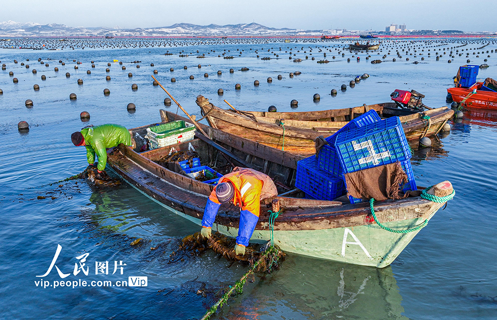 暴雪過后,2023年12月27日,在山東省榮成市各大海洋牧場海上養殖區,漁民們駕駛漁船出海,開展各類海上生產作業,呈現出一派雪后“海上冬耕”的繁忙景象。李信君攝