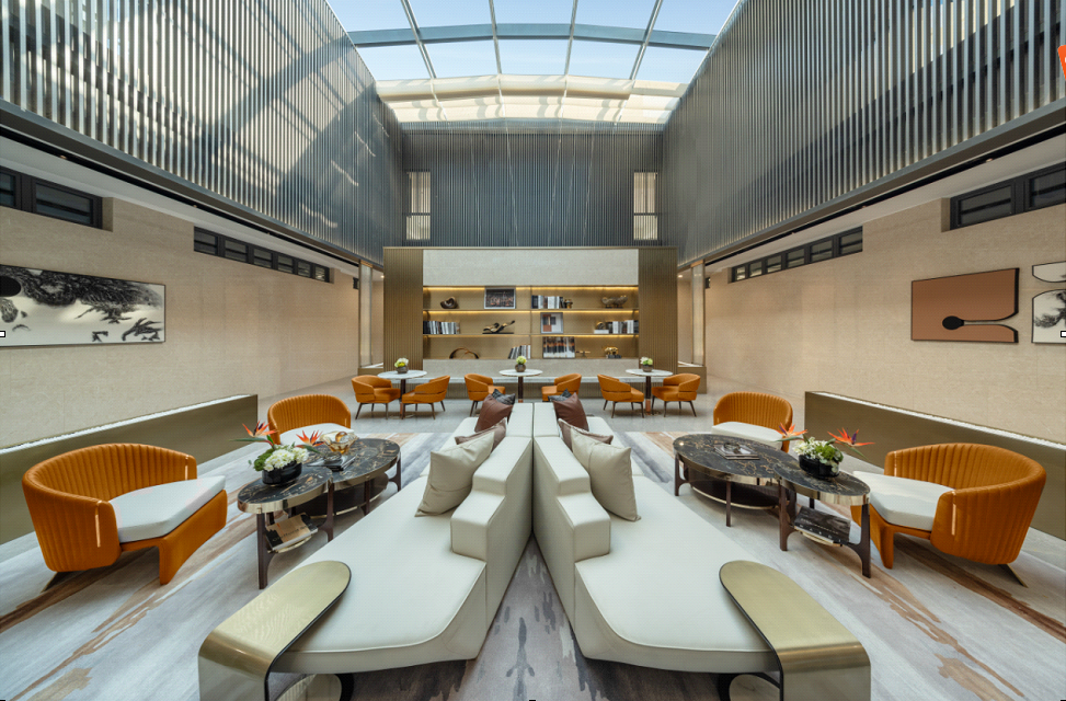 長(zhǎng)達(dá)40余米高約8.5米的社區(qū)大門(mén),放眼望去蔚為壯觀,大門(mén)前水景點(diǎn)綴,層層疊水和雕塑,加上濃郁綠植,將回家的儀式感拉滿。 以鋁板搭配玻璃幕墻打造的酒店式大堂,兼具功能與審美,同樣也是一個(gè)社區(qū)會(huì)客廳,內(nèi)部由書(shū)吧閱讀區(qū)、沙發(fā)休憩區(qū)、快遞收發(fā)區(qū)和接待區(qū)4大共享空間組成。業(yè)主可以于此或閱讀休閑或接待朋友、與鄰居洽談……