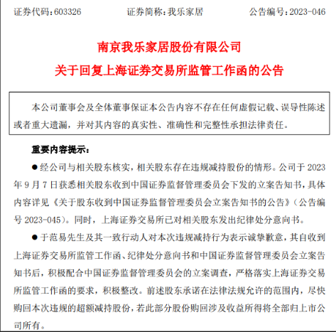 我樂(lè)家居回復(fù)上海證券交易所監(jiān)管工作函稱(chēng),于范易先生及其一致行動(dòng)人對(duì)本次違規(guī)減持行為表示誠(chéng)摯歉意,其自收到上海證券交易所監(jiān)管工作函、紀(jì)律處分意向書(shū)和中國(guó)證券監(jiān)督管理委員會(huì)立案告知書(shū)后,積極配合中國(guó)證券監(jiān)督管理委員會(huì)的立案調(diào)查,嚴(yán)格落實(shí)上海證券交易所監(jiān)管工作函的要求,積極整改。前述股東承諾在法律法規(guī)允許的范圍內(nèi),盡快購(gòu)回本次違規(guī)的超額減持股份,若此部分股份購(gòu)回涉及收益所得將全部歸上市公司所有。