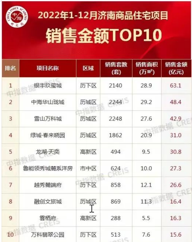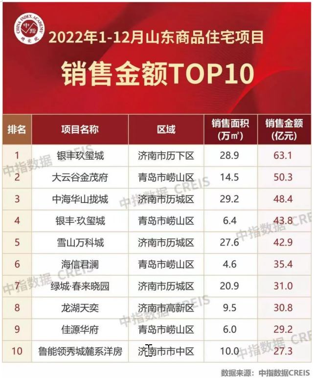 權威機構——中指研究院發布銷售業績,平添了這張答卷的“含金量”:濟南銀豐玖璽城連續4年奧體改善銷冠,2022更是登頂山東商品住宅項目銷售金額TOP1、濟南商品住宅項目銷售金額TOP1,成為實至名歸的銷量、口碑雙冠王。