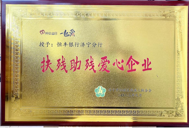 “99公益日”是響應國家9月5日“中華慈善日”的號召,發起的一年一度的全民公益活動,本次籌款活動旨在進一步提升濟寧市殘疾人基本公共服務水平,提高殘疾人生活質量,并倡導全社會關心、關愛殘疾人,活動現場匯聚了社會各界愛心人士及愛心企業。恒豐銀行濟寧分行率先垂范,參與現場捐款,并被濟寧市任城區殘疾人聯合會授予“扶殘助殘愛心企業”稱號。