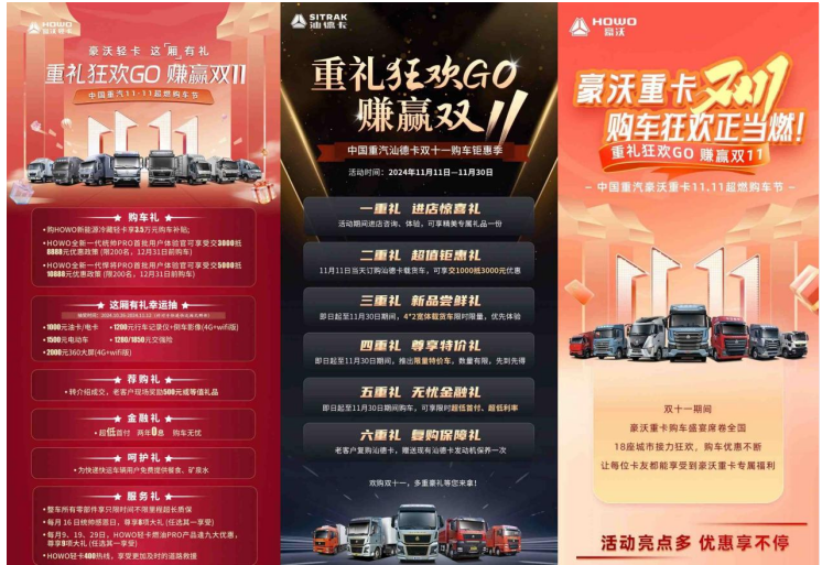 多元布局顯身手 多點(diǎn)發(fā)力齊開(kāi)花 在終端營(yíng)銷領(lǐng)域,中國(guó)重汽同樣展現(xiàn)出非凡的策略與執(zhí)行力。雙十一期間,為回饋廣大用戶,中國(guó)重汽汕德卡強(qiáng)勢(shì)推出“重禮狂歡GO,賺贏雙11”活動(dòng),力獻(xiàn)超值鉅惠、新品嘗鮮、尊享特價(jià)、復(fù)購(gòu)保障等六重購(gòu)車好禮。與此同時(shí),豪沃重卡在全國(guó)18座城市同步啟動(dòng)團(tuán)購(gòu)盛宴,掀起前所未有的購(gòu)車狂潮。更值得一提的是,HOWO輕卡滿載誠(chéng)意與驚喜,推出一系列前所未有的優(yōu)惠福利,誠(chéng)邀廣大卡友共襄年度購(gòu)車盛宴,讓每一位客戶都能馳騁物流江湖,共創(chuàng)事業(yè)新輝煌。