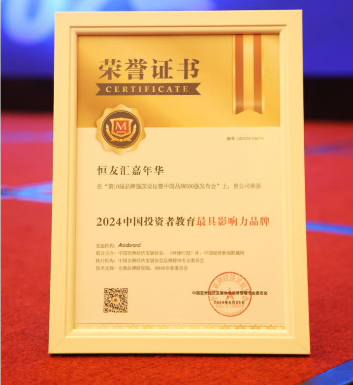 《恒友匯嘉年華》榮膺“2024中國投資者教育最具影響力品牌” 這是繼榮膺“金蜜蜂直播營銷類金獎”“投資者教育直播欄目金獎”后,《恒友匯嘉年華》斬獲的第三個重磅殊榮,充分體現了其在投教垂直領域的專業性與品牌影響力。 固本強基 助力品牌強國 放眼全球經濟格局,品牌力量日益成為國家競爭力的重要體現,我國也高度重視。2014年5月10日,我國提出要推動中國制造向中國創造轉變、中國速度向中國質量轉變、中國產品向中國品牌轉變的“三個轉變”。2017年,國務院批準將每年5月10日確立為“中國品牌日”。 作為中國品牌國際化推廣的權威論壇,“品牌強國論壇”已經成功舉辦九屆,得到國際政商名流、全球500強企業、海內外品牌學術機構及媒體的積極參與和大力支持。已服務超過18,000家會員企業,幫助1,200多個品牌傳揚世界,見證了1,000多家高新技術企業的成長與發展,成為中國品牌走向世界的重要橋梁。 為更好地樹立品牌榜樣,賦能企業品牌價值變現,本屆論壇重磅發布“2024中國品牌500強”“2024中國品牌年度人物”、特別獎等研究成果。作為行業久負盛名的重磅大獎,該系列獎項的評選不僅嚴格秉持“科學、客觀、權威、先進”的行業標準,還在國標基礎上,用Asiabrand自主研發的“品牌云評”人工智能大數據應用系統,對入選企業進行全面的品牌價值測評,力求更客觀地展現企業品牌價值、市場競爭力及企業未來品牌增值趨勢。