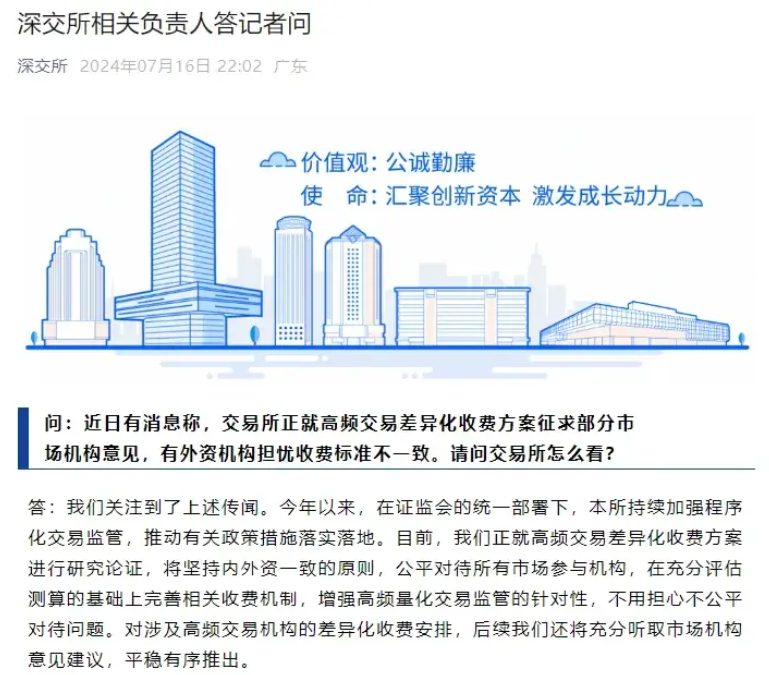 近日有消息稱,交易所正就高頻交易差異化收費方案征求部分市場機構意見,有外資機構擔憂收費標準不一致。7月16日,上交所發布和深交所微信公眾號發布回應。