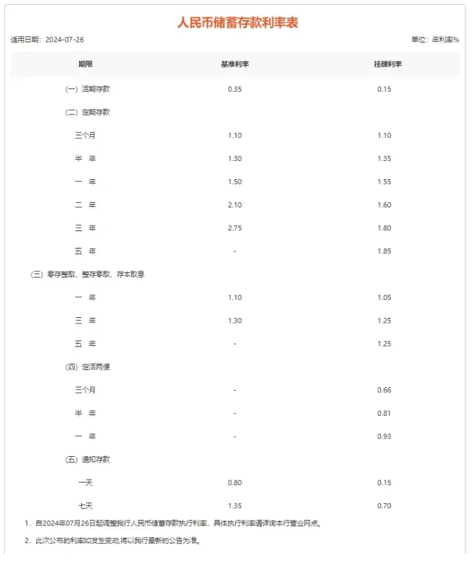 具體來(lái)看,招商銀行調(diào)整后的人民幣存款掛牌利率與六大銀行保持一致。活期存款年利率由0.20%調(diào)整為0.15%,下調(diào)5個(gè)基點(diǎn);整存整取定期存款三個(gè)月、六個(gè)月、一年期由1.15%、1.35%、1.45%調(diào)整為1.05%、1.25%、1.35%,均下調(diào)10個(gè)基點(diǎn);二年、三年、五年期由1.65%、1.95%、2.00%調(diào)整為1.45%、1.75%、1.80%,均下調(diào)20個(gè)基點(diǎn)。