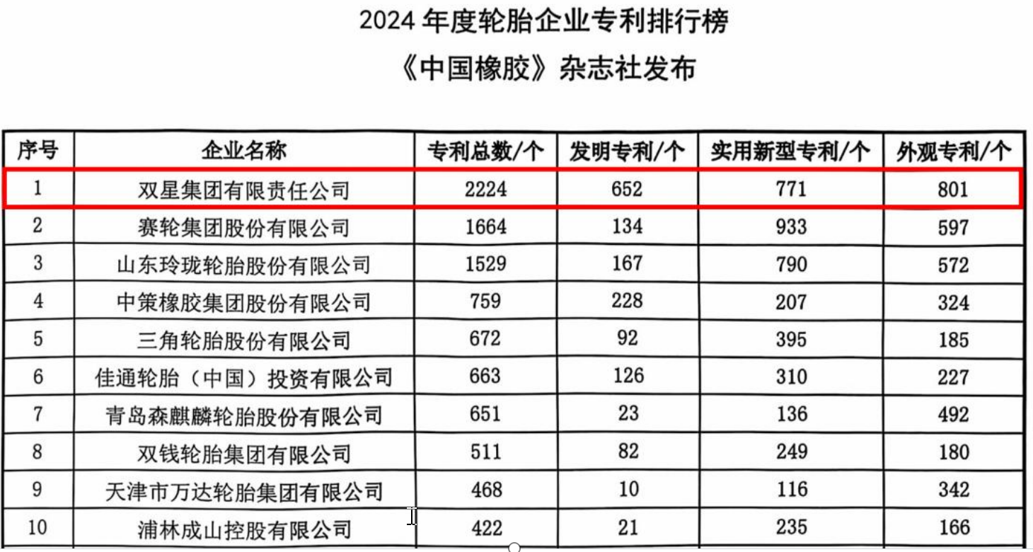 9月11日,中國橡膠工業協會在江蘇蘇州舉辦“2024年度中國輪胎企業排名發布會暨第二十四屆全國橡膠工業信息發布會”,會上隆重發布了2024年度中國輪胎企業排名。雙星集團專利總數排名第一,是第二名的1.3倍,其中發明專利是第二名的4.9倍;乘用車輪胎排名第一,是第二名的1.6倍;榮登“中國輪胎企業排行榜”第二位。這也是“雙星輪胎”品牌成為中國首個價值超千億的輪胎品牌之后,獲得的又一殊榮,彰顯了雙星強大的產品競爭力、技術創新能力和行業影響力。