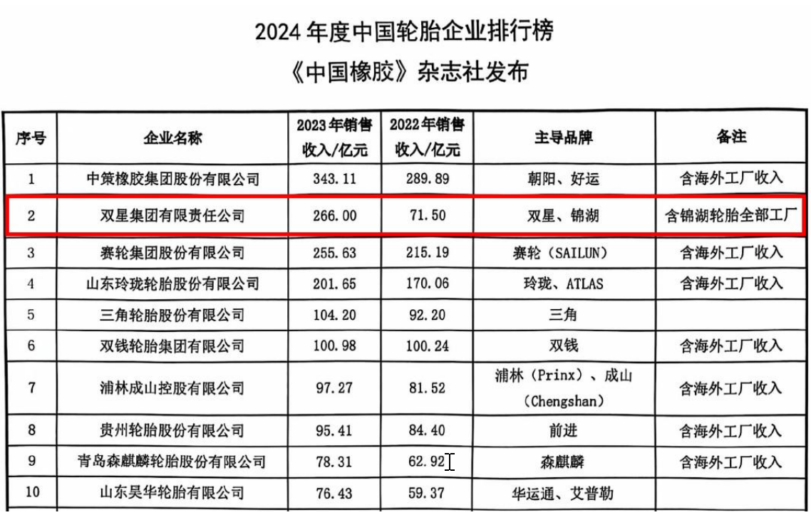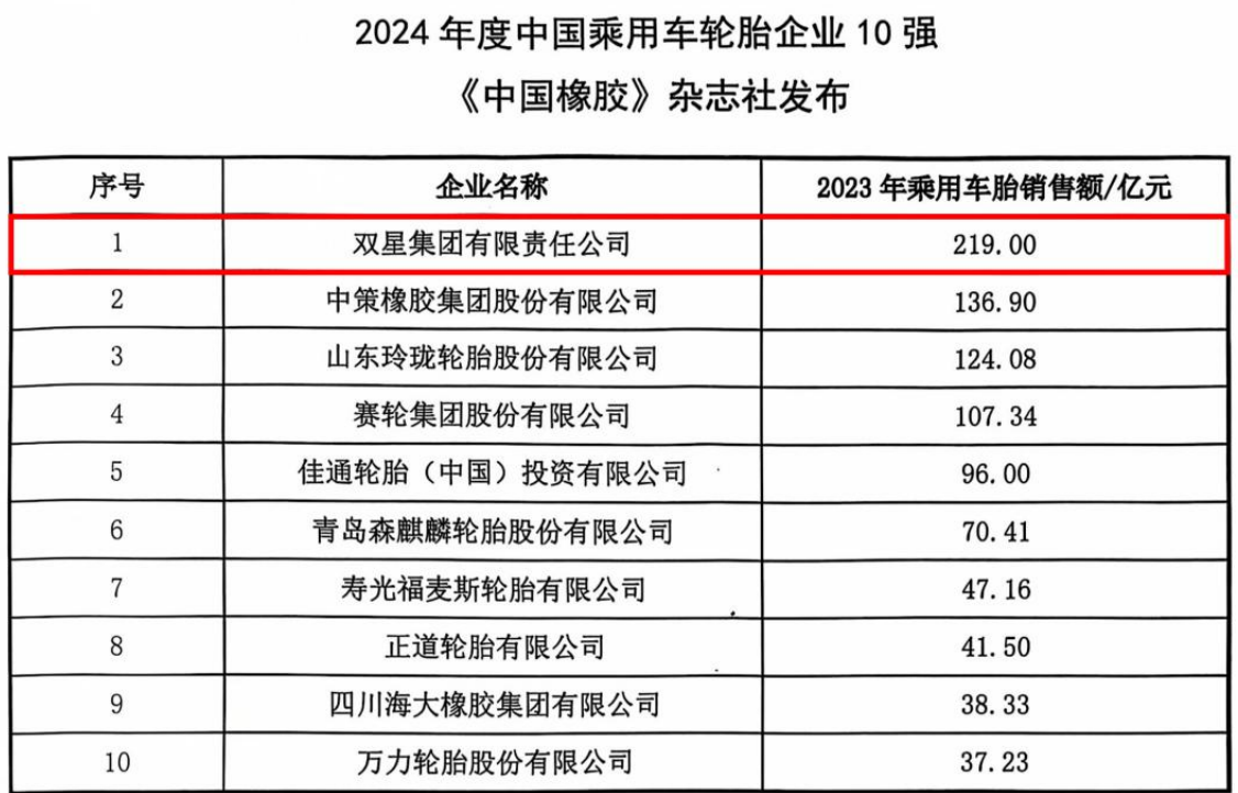 2024行業協會排名 雙星榮登輪胎第二、乘用車胎第一