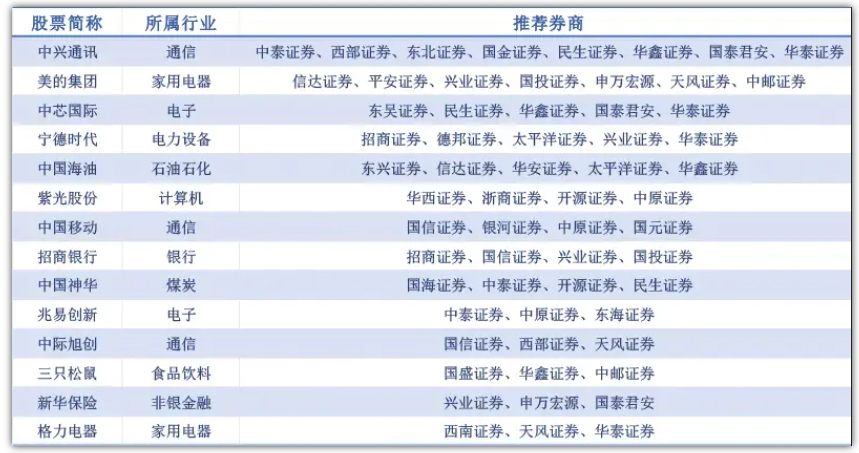 美的集團也獲得多家券商共同推薦。天風證券認為,國內以舊換新政策有望拉動需求,美的集團各業務逐步突破并強化跨產品事業部橫向協同,有望伴隨規模擴張逐步優化盈利能力。此外,中芯國際、寧德時代、中國海油、紫光股份等個股也獲得4家及以上券商共同推薦。
