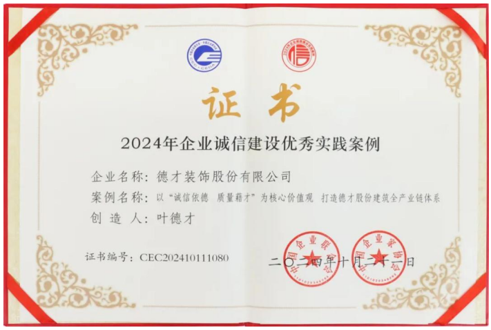 近日,由中國企業聯合會、中國企業家協會主辦的“2024年企業誠信建設實踐案例征集活動”圓滿落幕,通過企業自主申報、各地企聯及有關中央企業組織推薦,經有關專家按照標準和程序嚴格審核,“2024 年企業誠信建設十佳實踐案例”和“2024 年企業誠信建設優秀實踐案例”在中國企業誠信網正式公示。德才股份“以‘誠信依德,質量藉才’為核心價值觀打造建筑全產業鏈體系”榮獲2024年企業誠信建設實踐案例。