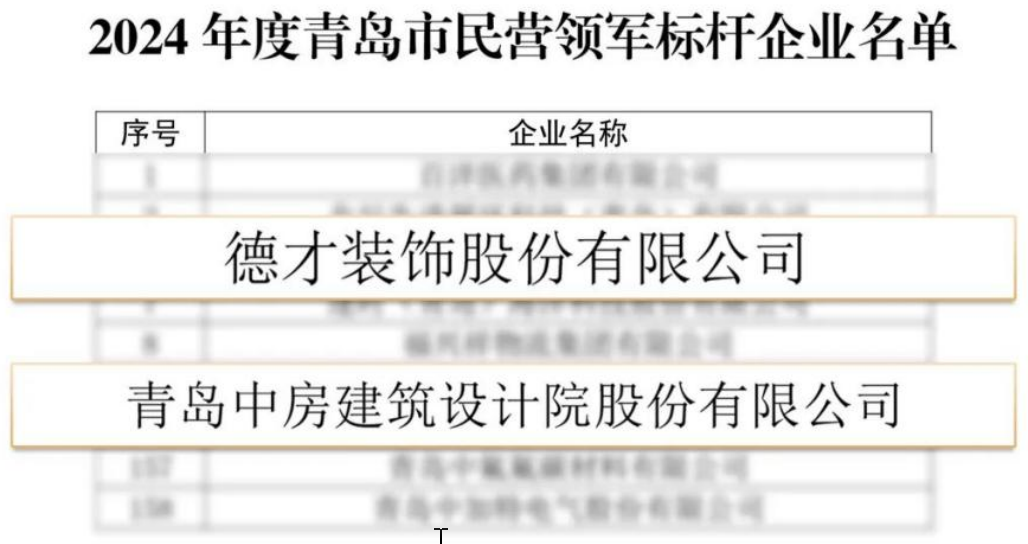 近日,青島市民營經濟發展局公布2024年度青島市民營領軍標桿企業名單,德才股份連續第三年榮獲“青島市民營領軍標桿企業”稱號,旗下中房設計首次入圍該榜單。