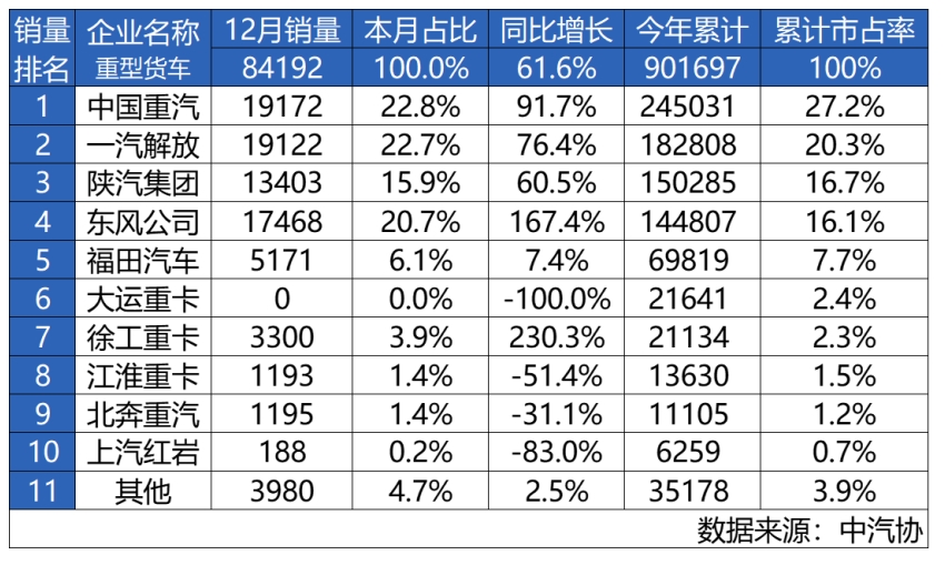 2024年是商用車行業充滿挑戰與變革的一年,國內市場百舸爭流,優勝劣汰的趨勢逐漸分明,能源轉型與技術迭代為行業發展擘畫出全新藍圖。2024年收官已定,我國重卡市場全年累計銷售901697輛,其中12月份共計銷售84192輛,環比11月上漲22.9%,同比大幅增長61.6%,市場一洗頹勢、強勢上揚,大大鼓舞了重卡行業產業鏈上下游的信心。 中國重汽堅持為客戶創造最大價值,全力以赴搶市場、抓訂單、保交付,經營業績持續領跑行業,創造了高質量發展的重汽速度!2024年收官之戰,中國重汽12月重卡銷量共計19172輛,同比大幅增長91.7%;全年累計銷售245031輛,同比增長4.6%,市占率達27.2%,以扛鼎之姿,斬獲年度重卡銷量第一、市占率第一。