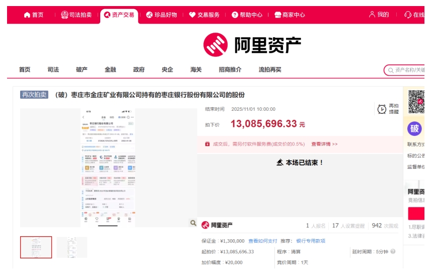 阿里資產(chǎn)交易平臺(tái)最新信息顯示,棗莊銀行2434.10萬(wàn)股股份拍賣于11月1日成交,成交價(jià)為1308.57萬(wàn)元,每股約0.538元。本場(chǎng)拍賣僅有1人報(bào)名,最終以起拍價(jià)成交。