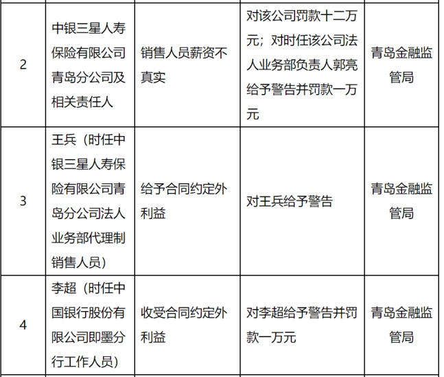日前,國家金融監督管理總局青島監管局(下稱“青島金融監管局”)公布的行政處罰信息顯示,某國有大行旗下的中銀三星人壽保險有限公司青島分公司(下稱“中銀三星保險青島分公司”)和該行即墨分行的2名員工因“收受合同約定外利益”和“給予合同約定外利益”行為雙雙領罰,中銀三星保險青島分公司更是因“銷售人員薪資不真實”被處以罰款12萬元。