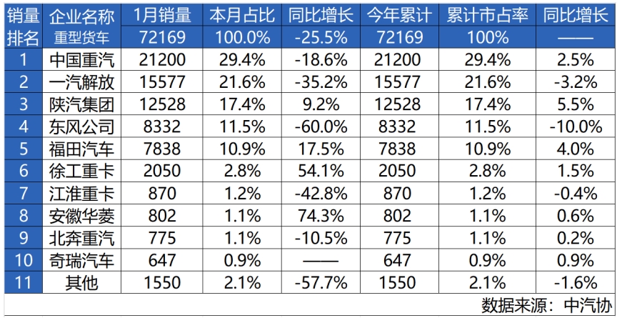 2025年1月份,我國(guó)重卡市場(chǎng)共計(jì)銷售72169輛,環(huán)比下降14.3%,與上年同期相比下滑25.5%,出現(xiàn)環(huán)比、同比雙降的局面。然而強(qiáng)者恒強(qiáng),中國(guó)重汽憑借超凡產(chǎn)品實(shí)力逆勢(shì)突圍,開啟首月“爆單”模式——1月實(shí)現(xiàn)重卡銷量21200輛,市占率可達(dá)29.4%,同比增長(zhǎng)2.5%,開局?jǐn)孬@行業(yè)銷量、市占率“雙冠軍”!這份開年答卷,不僅彰顯其行業(yè)領(lǐng)跑者的硬核實(shí)力,更以產(chǎn)品、服務(wù)、技術(shù)的全面升級(jí),為商用車市場(chǎng)注入一劑強(qiáng)心針。