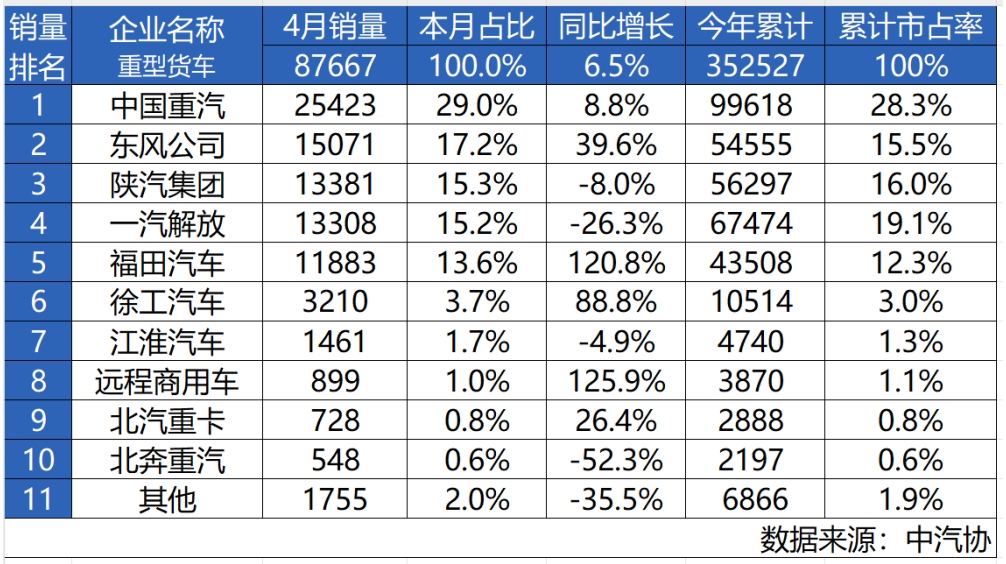 重卡,是檢驗商用車企硬核實力的“核心指標”——它承載著動力、安全與效率的極限考驗,更是技術底蘊與市場掌控力的試金石。2025年4月份,中國重汽以25423輛重卡銷量再度奪魁,同比逆勢上漲8.8%;1-4月累計銷量99618輛,市占率28.3%,連續(xù)3年市占率第一!這份“最具含金量第一”的分量與價值自然不言而喻。 據(jù)數(shù)據(jù)顯示,我國重卡市場4月共計銷售87667輛,環(huán)比3月回落21.4%,比上年同期上漲6.5%;1-4月行業(yè)累計銷售352527輛,與去年同期基本持平。數(shù)據(jù)的背后,折射出政策紅利影響、終端需求分化、成本博弈等多重變量交織影響下的市場新態(tài)勢。