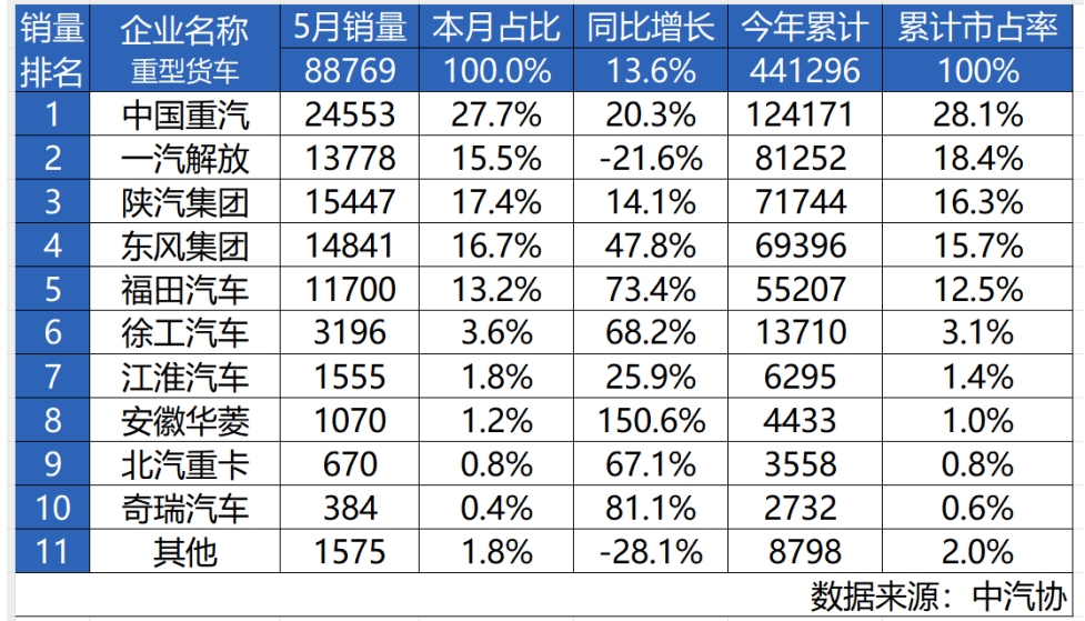 5月,重卡市場銷量出爐,再次成為各方矚目的焦點——我國重卡市場共計銷售88769輛,同比上年同期上漲13.6%,實現了自4月份以來的兩連漲。其中,中國重汽1-5月累計重卡銷售124171輛,5月銷量為24553輛,同比勁增20.3%!毫無懸念再次蟬聯銷量、市占率“雙料冠軍”。