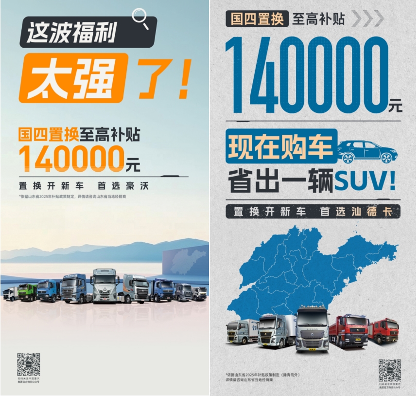 隨著山東省2025年老舊營運貨車報廢更新工作的全面啟動,中國重汽率先推出全年最優置換補貼福利!這是對國家政策的積極響應,更是對萬千用戶信賴的真摯回饋。在國家報廢更新補貼政策的基礎之上,中國重汽打出購車優惠+服務福利+額外贈送等一系列“組合拳”,讓購車成本一降再降,以實際行動助力更多用戶快速實現車輛升級和競爭力的提升。