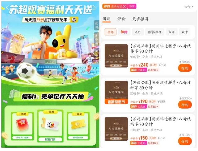 ▲美團休閑玩樂上線“蘇超”主題活動 美團App 為進一步助燃“蘇超效應”、助力本地服務消費,美團休閑玩樂上線了主題活動為江蘇休閑玩樂商家提供專屬流量支持。打開美團App,搜索“蘇超足療免單”進入活動頁,市民游客在線上下單相關主題套餐,還有觀賽門票、一年按摩足療免單套餐等福利同步發放。