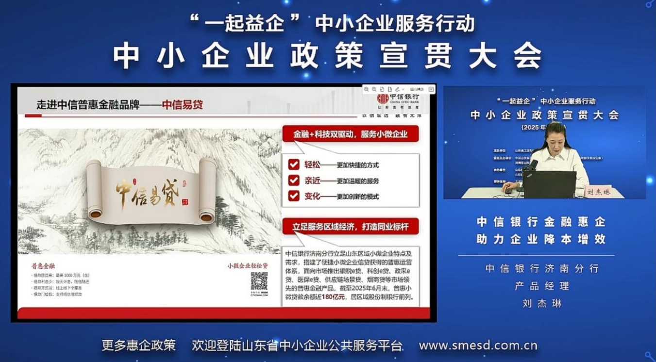 9月4日,中信銀行濟南分行受邀參加由山東省中小企業公共服務平臺舉辦的“一起益企”中小企業服務政策宣貫大會,向600多家中小企業宣講惠企政策。 會議由山東省工業和信息化廳主辦、山東省普惠中小企業公共服務中心承辦,邀請山東省金融監督管理局、中信銀行濟南分行和永贏金租等單位交流發言,讓企業“知、懂、用、享”惠企政策。 中信銀行濟南分行主要講解了為解決中小企業融資難題推出的“中信易貸”系列產品——純信用方式、全流程線上支持科技企業融資需求的“科創e貸”、服務政府采購項目供應商的“政采e貸”、適用于供應鏈上下游企業的“票據e貸”,為幾乎所有經營場景的小微企業都提供了適配方案,同時結合真實案例為參會企業現場答疑,“流程簡、期限活、利率低、放款快”的優勢,讓不少企業眼前一亮。